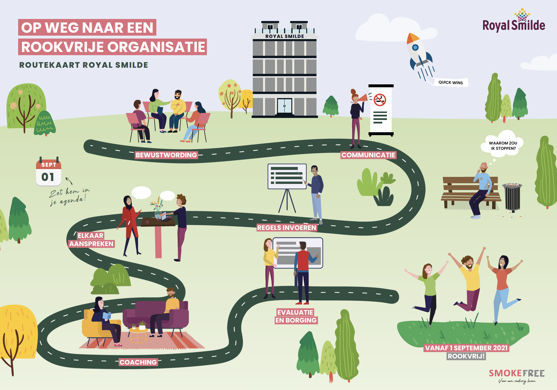 Deze maatregelen zijn een onderdeel van het Nationale Preventieakkoord waarin veel afspraken zijn gemaakt die gaan over gezondheid. Voor veel bedrijven is dit verbod het laatste zetje om een gedegen rookvrij beleid op te zetten. SmokeFree helpt veel van deze organisaties. Dit doen we met een routekaart naar een rookvrij bedrijf. Naast de boodschap over het stoppen met roken die we door middel van posters, filmpjes of zelfs een event overbrengen bieden we hulp. Bijvoorbeeld in de vorm van groepsbijeenkomsten of persoonlijke coachingstrajecten voor degenen die willen stoppen.